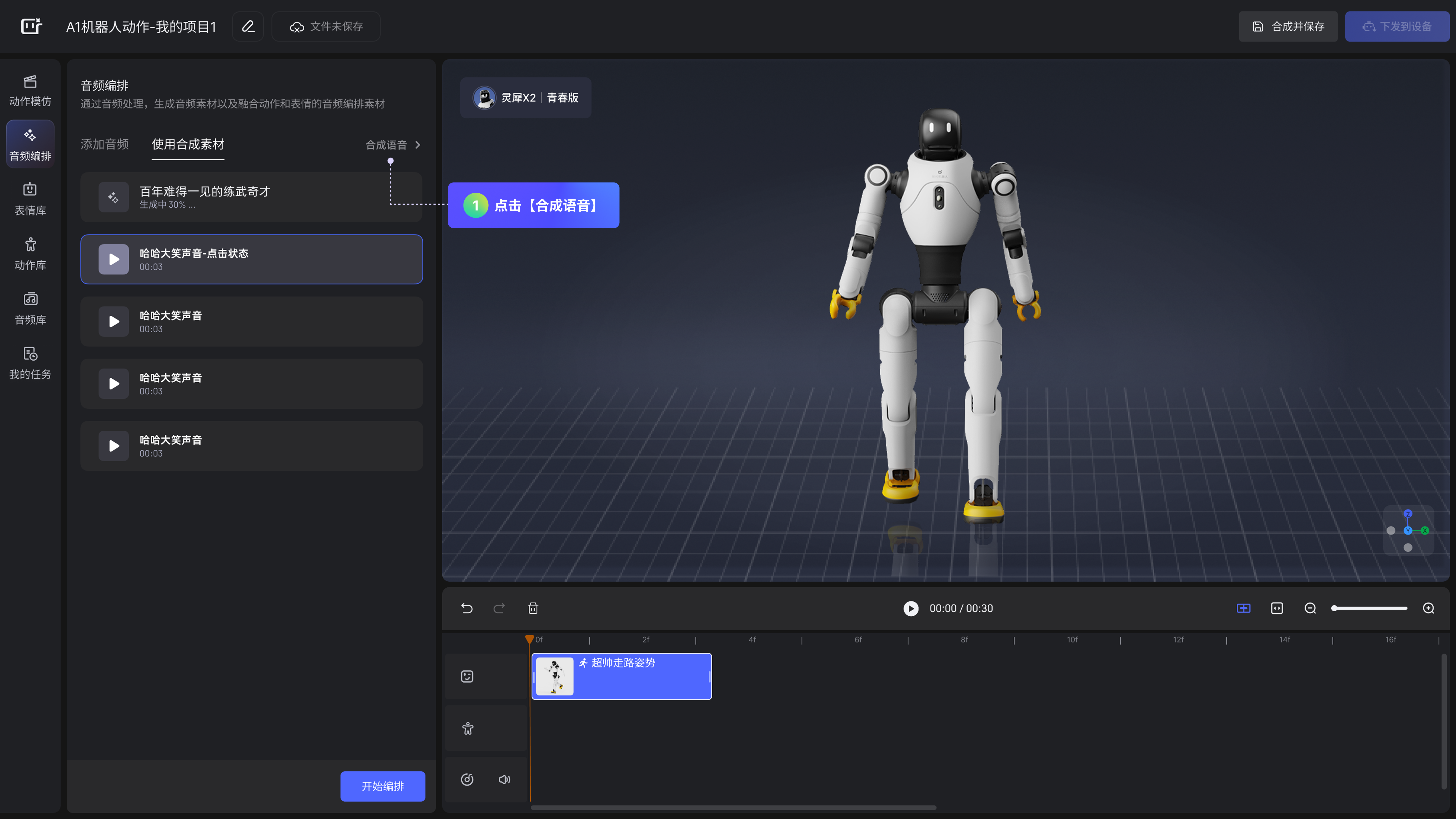 可在左侧功能栏通过「动作模仿」「音频编排」生成相应素材,步骤详见 2.动作模仿 3.音频编排