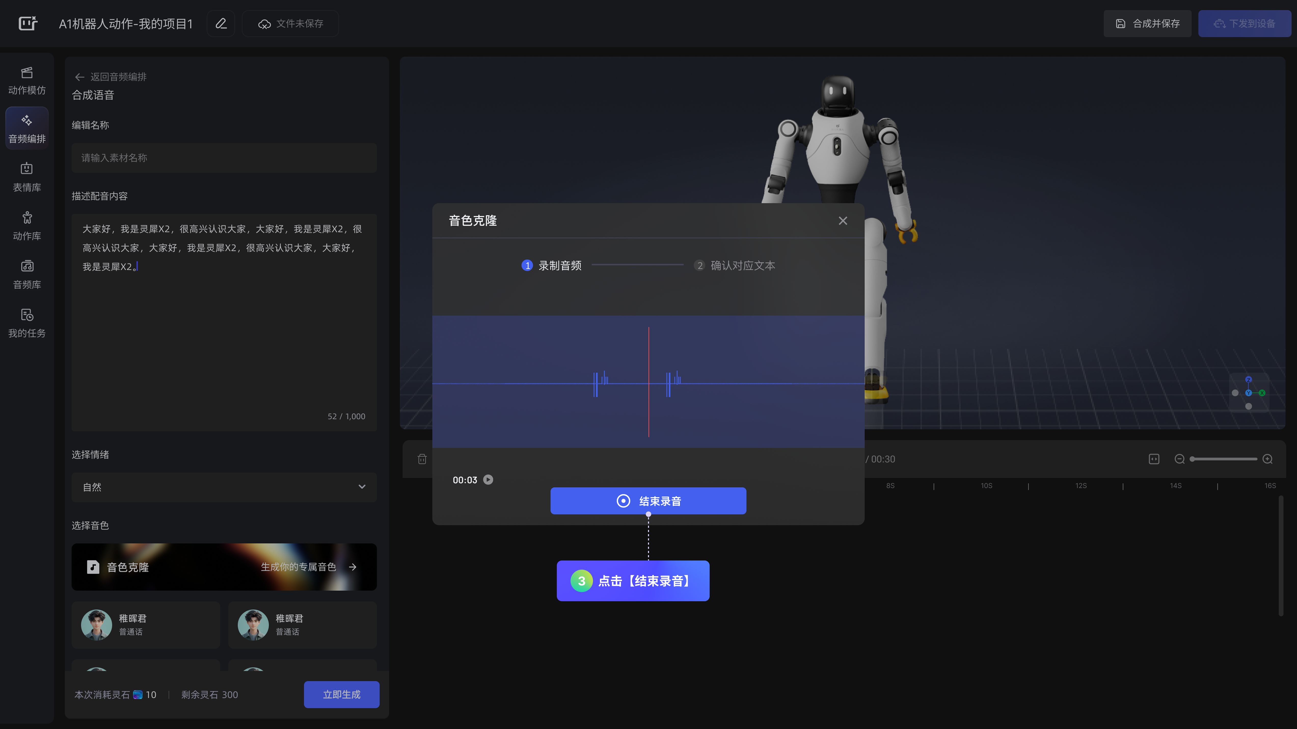 中间「预览区」:实时显示机器人演绎画面,可随时调整角度、缩放视图,预览当前动作、表情效果。