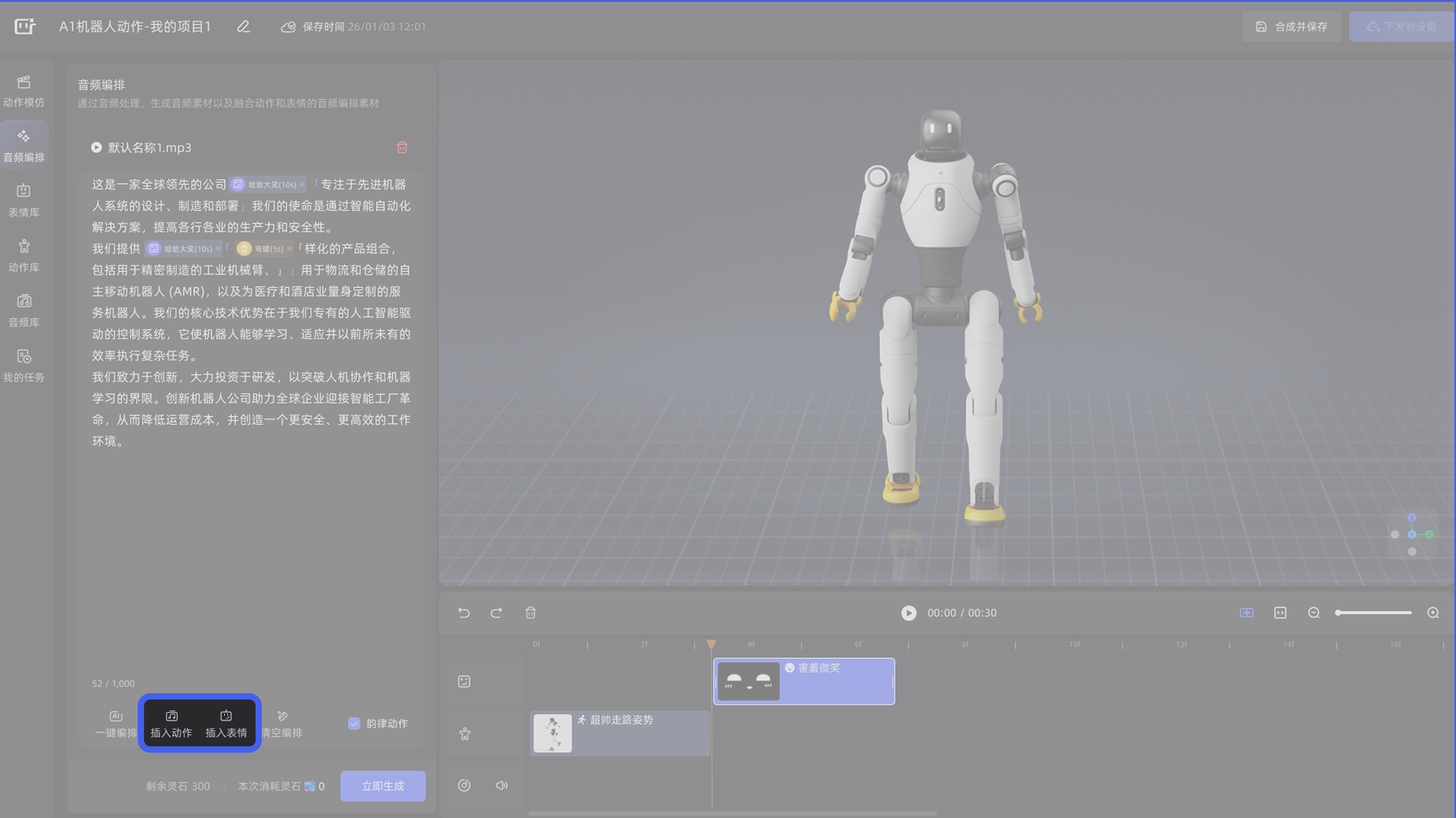 作品:由动作、表情、音频等一种或多种素材单元,在时间轴排布组合而成的完整创作存档,既可下发至机器人执行演绎,也可随时进行二次修改与编辑。