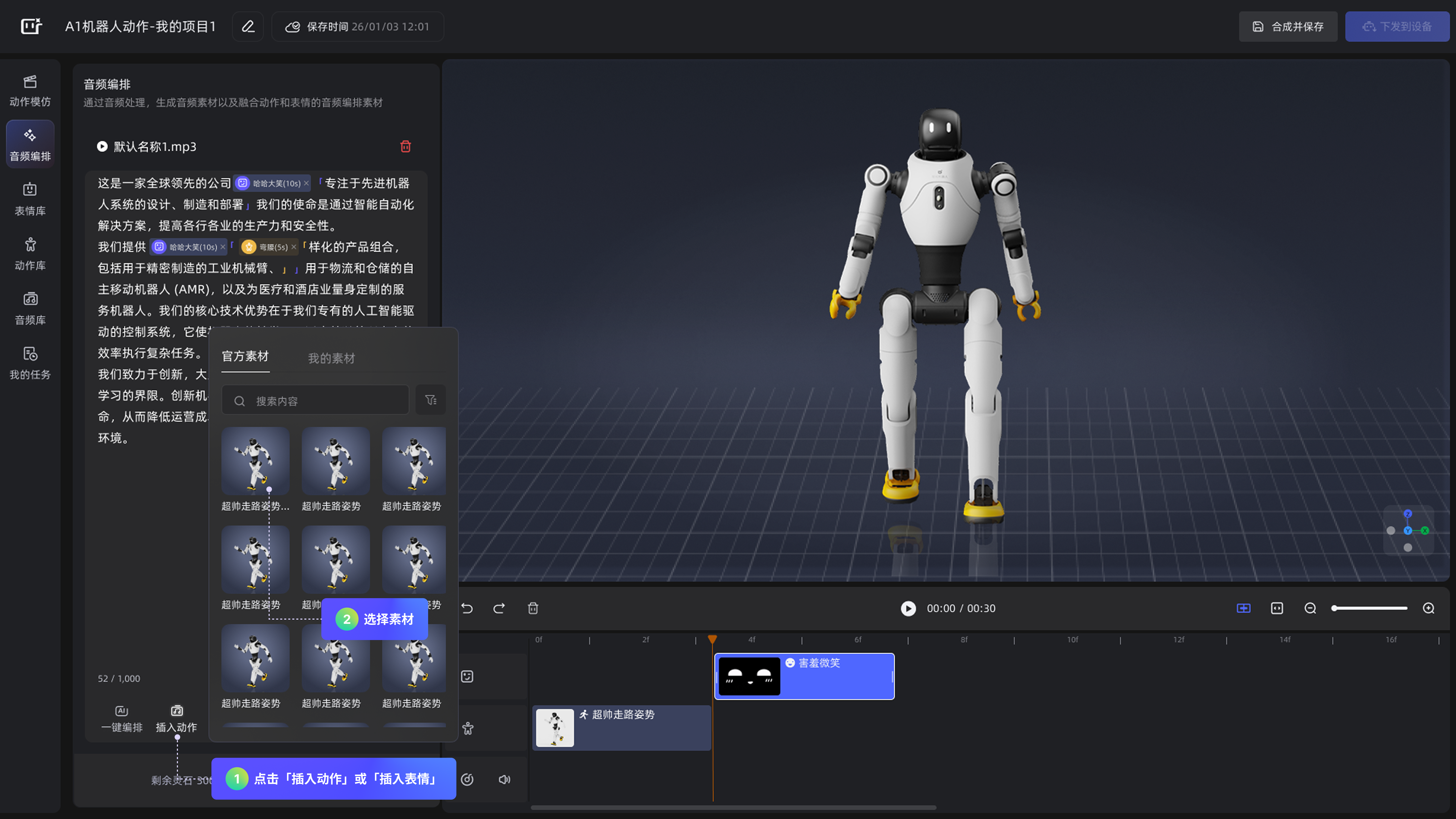 素材:指可用于合成演绎作品的动作、表情、音频等基础单元,需组合为作品后,方可用于机器人演绎。