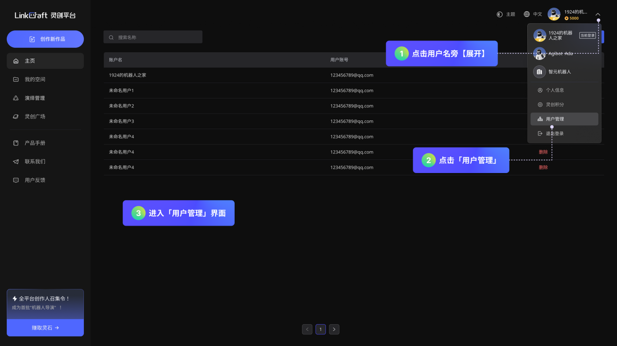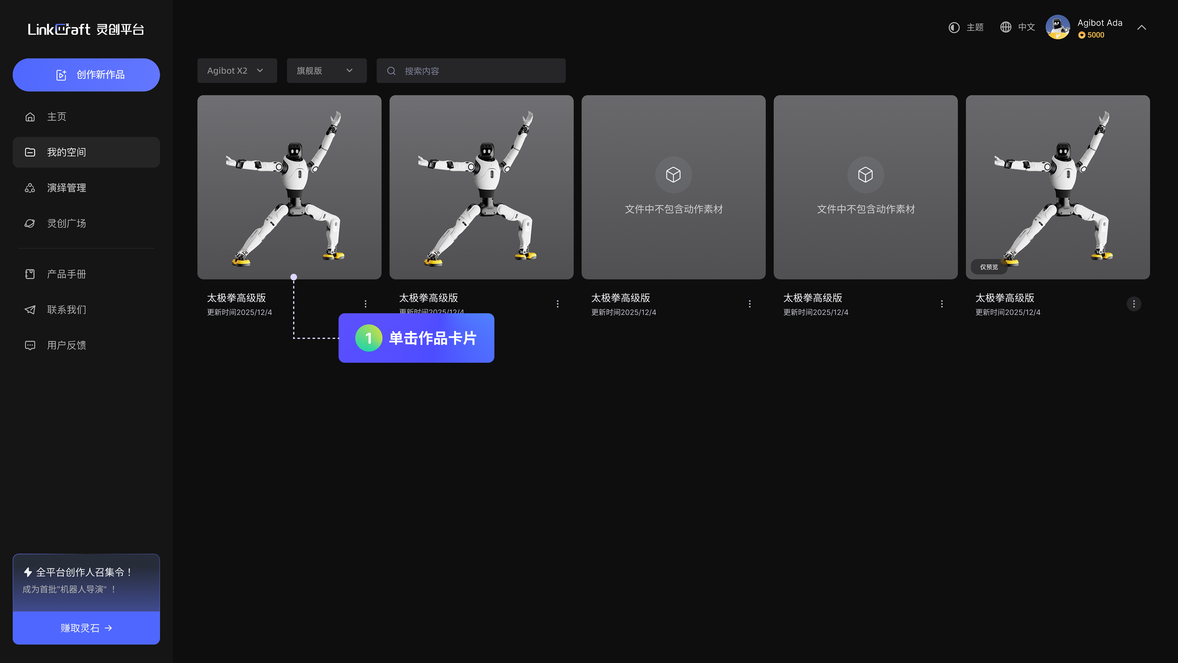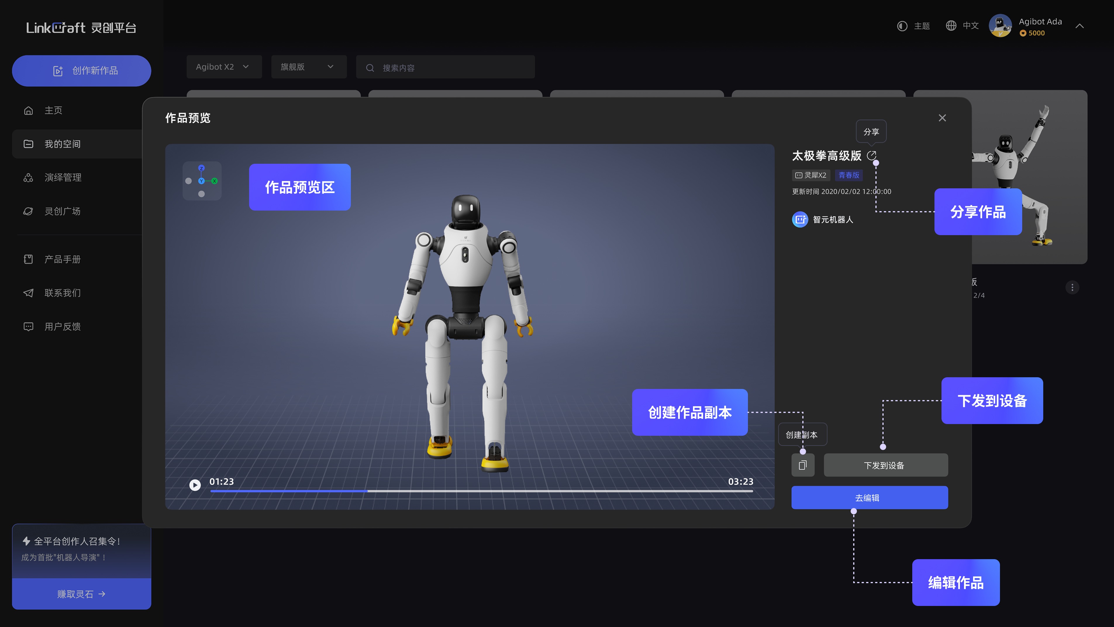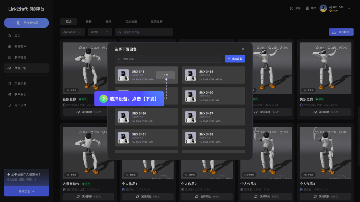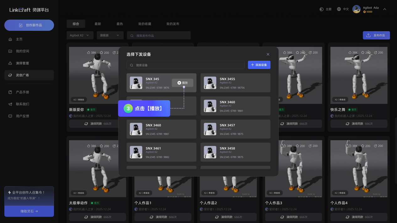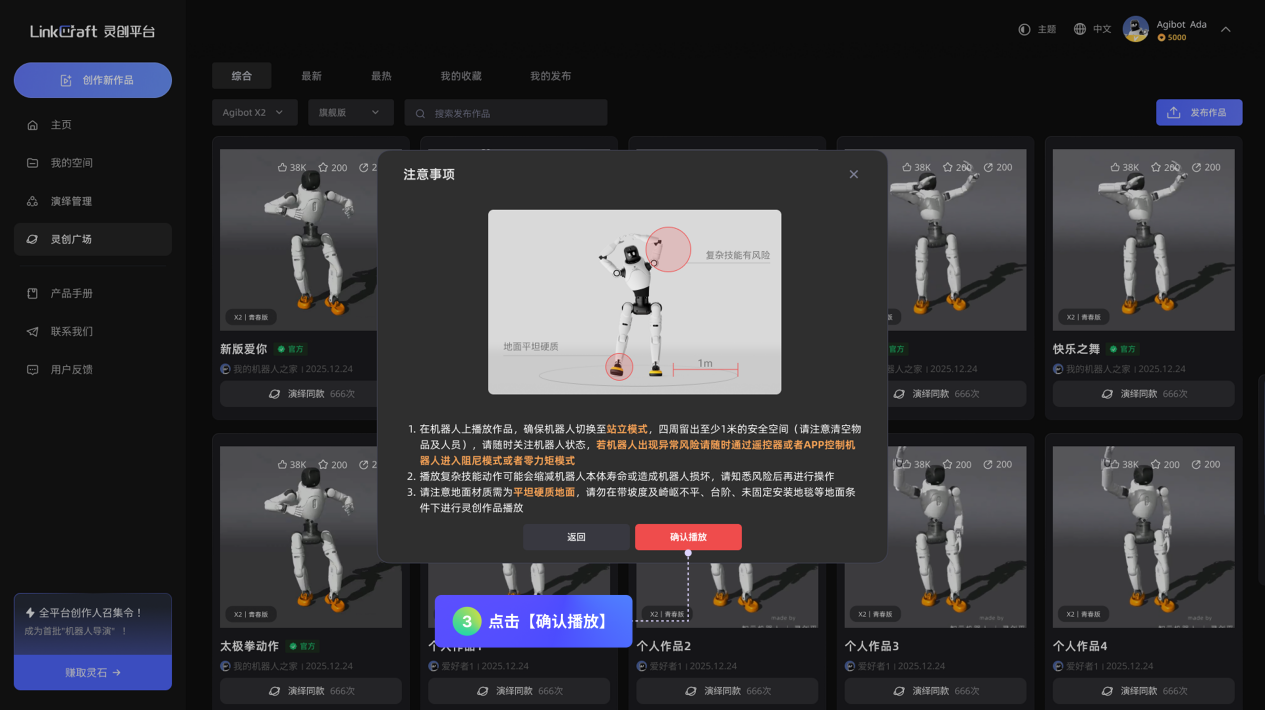 「灵创广场」:可在此查看、收藏全社区的机器人演绎作品,同时,用户可在此将个人作品分享至「灵创广场」,与全球用户共享创作成果。