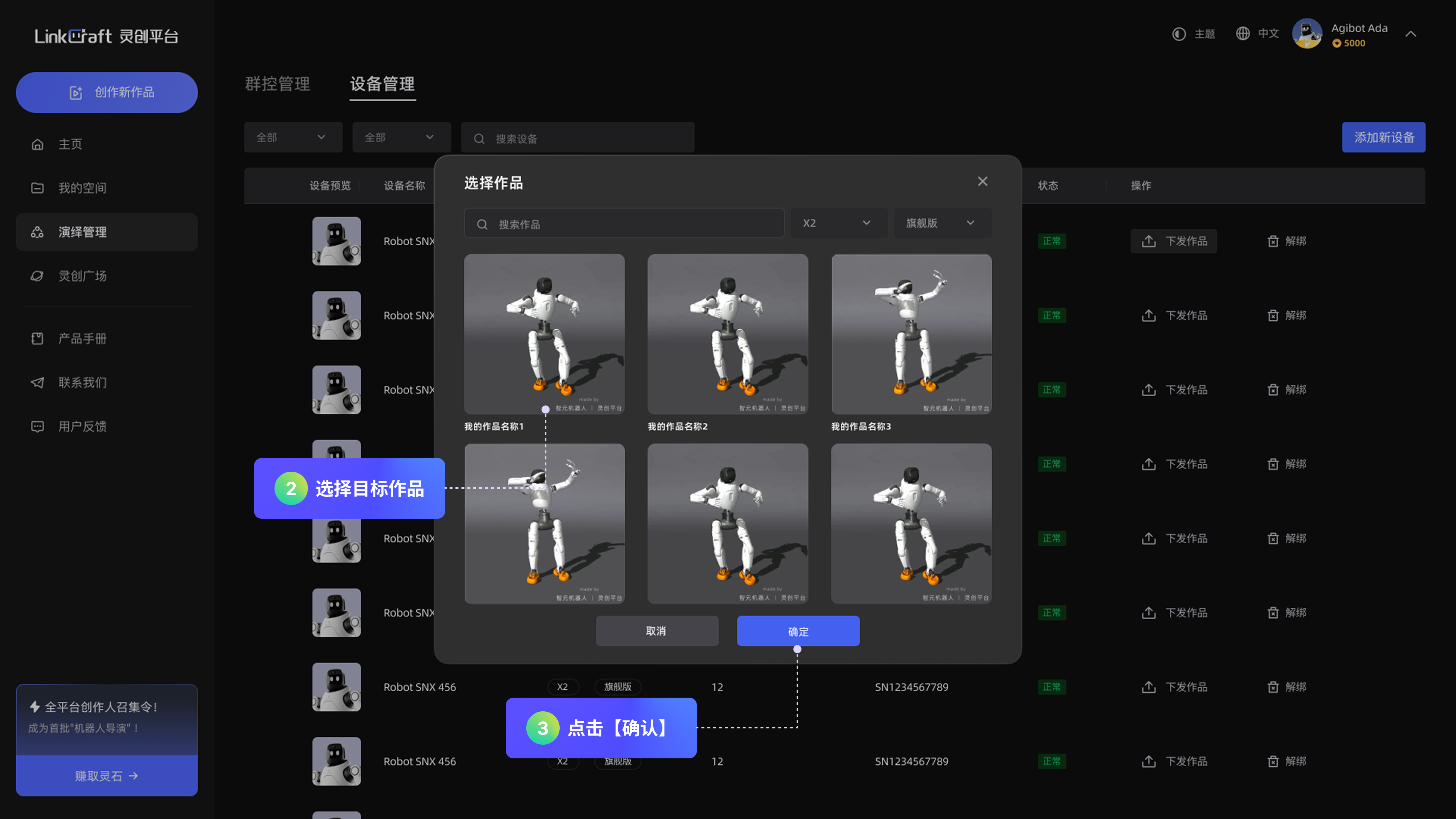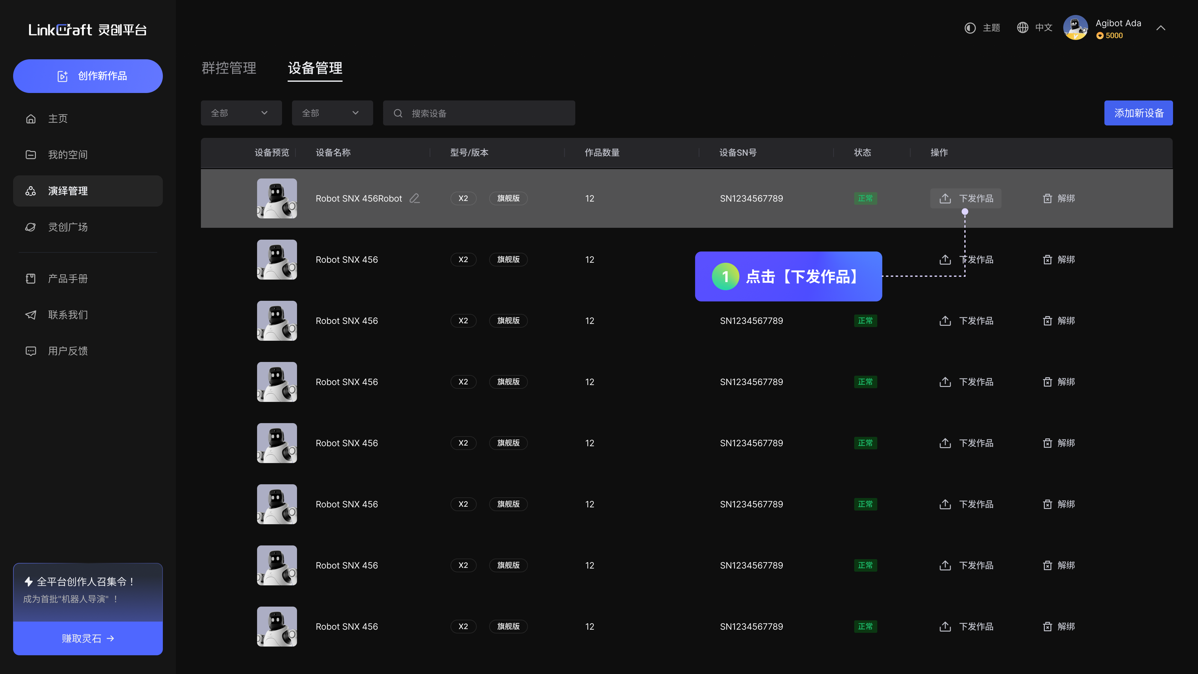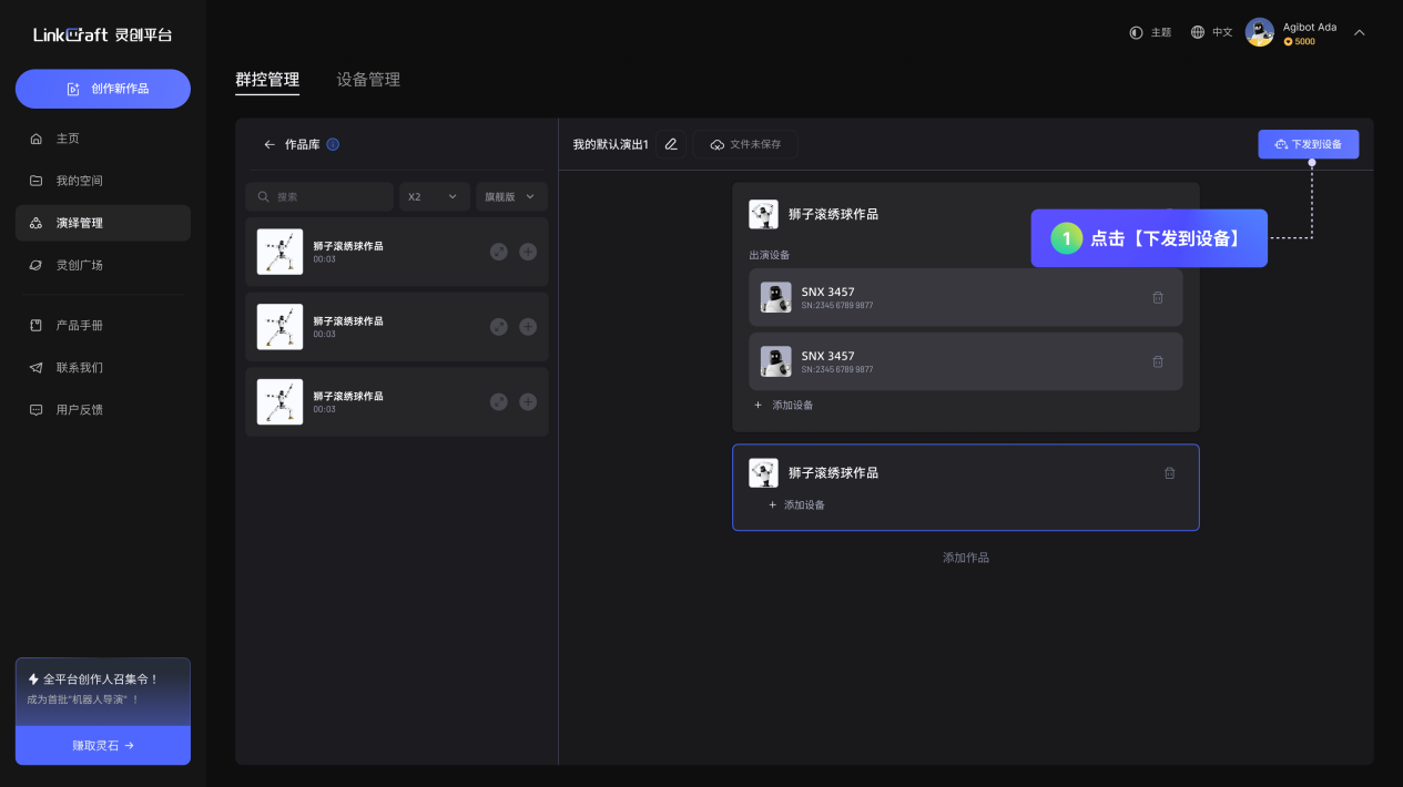 可以对指定机器人进行下发演绎作品。