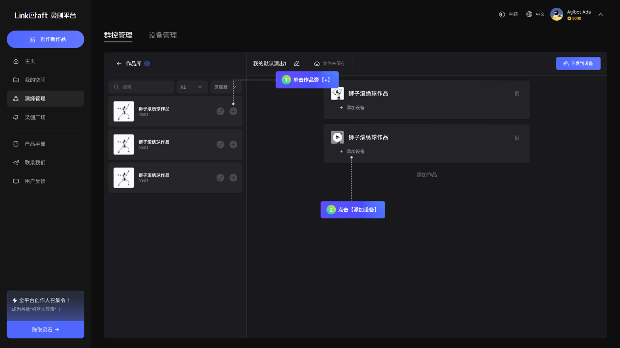 「演绎管理」:内含「设备管理」和「群控管理」两部分功能。「设备管理」用于查看机器人信息,绑定和管理机器人设备;「群控管理」用于创建并管理多设备同步的演绎任务,实现多台机器人协同表演或批量控制。